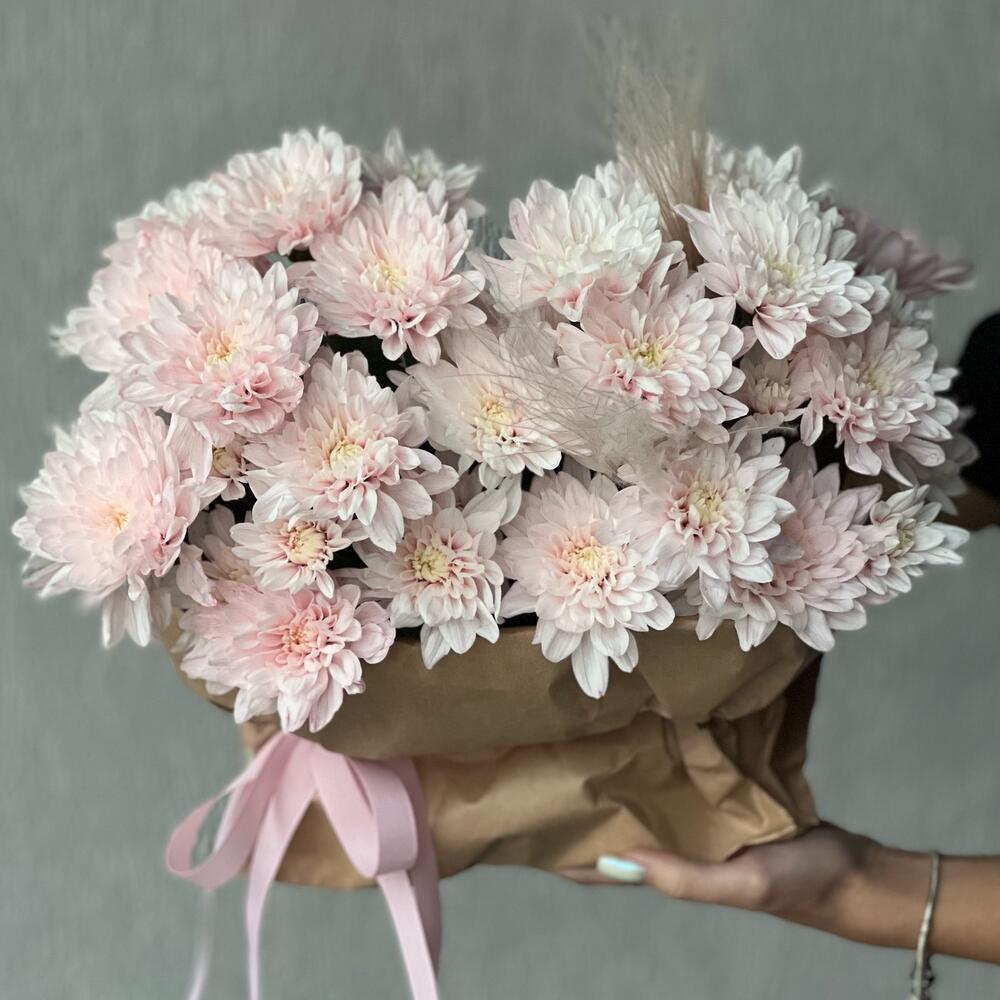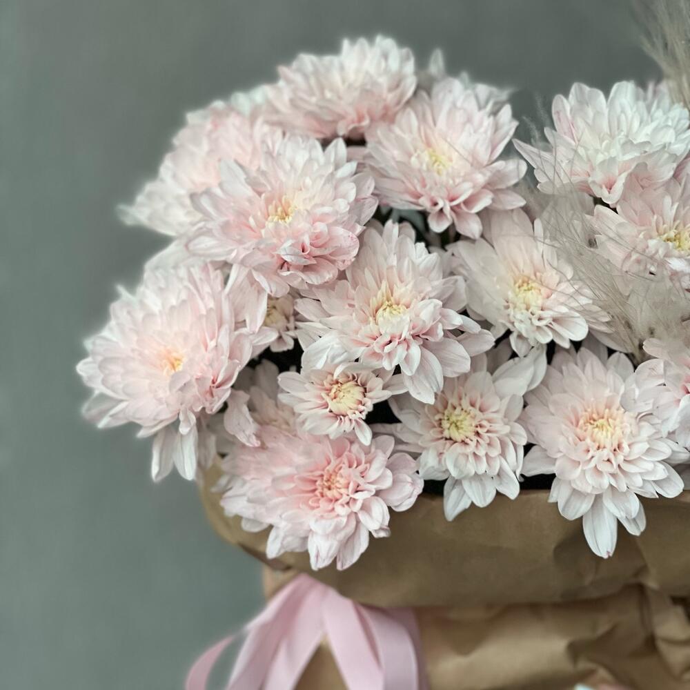 Невероятно стойкая композиция из нежной пышной хризантемы будет очень долго радовать получателя, а стильная крафтовая упаковка впишется в любой интерьер🤍